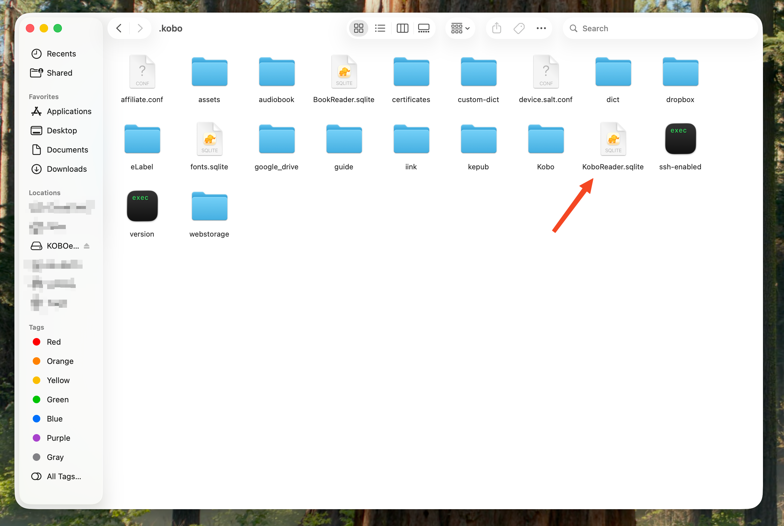 ℹ️ Note If you do not see the .kobo folder, your computer likely hides "hidden files". Press Command + Shift + Period on a Mac or View -> Hidden Items on Windows.