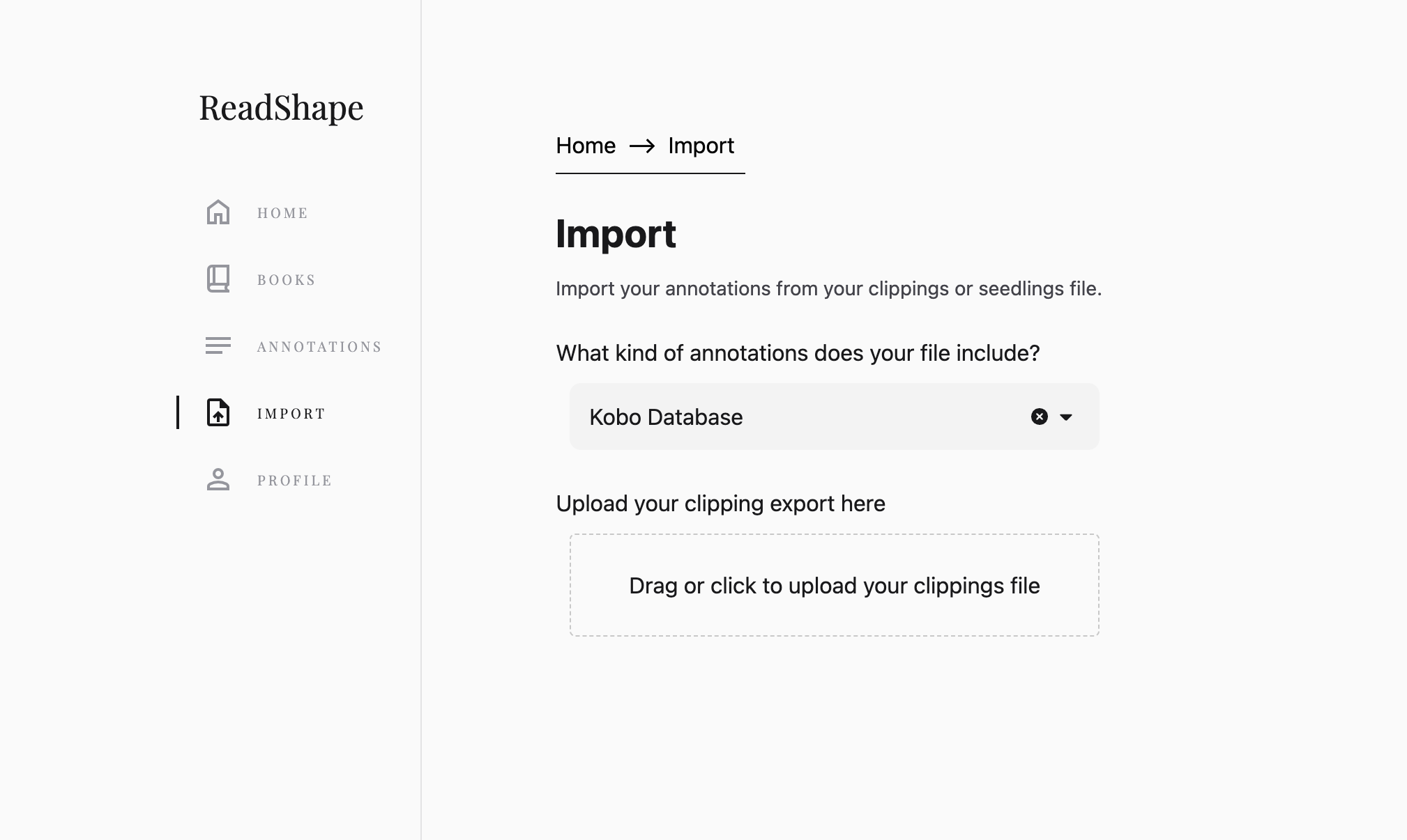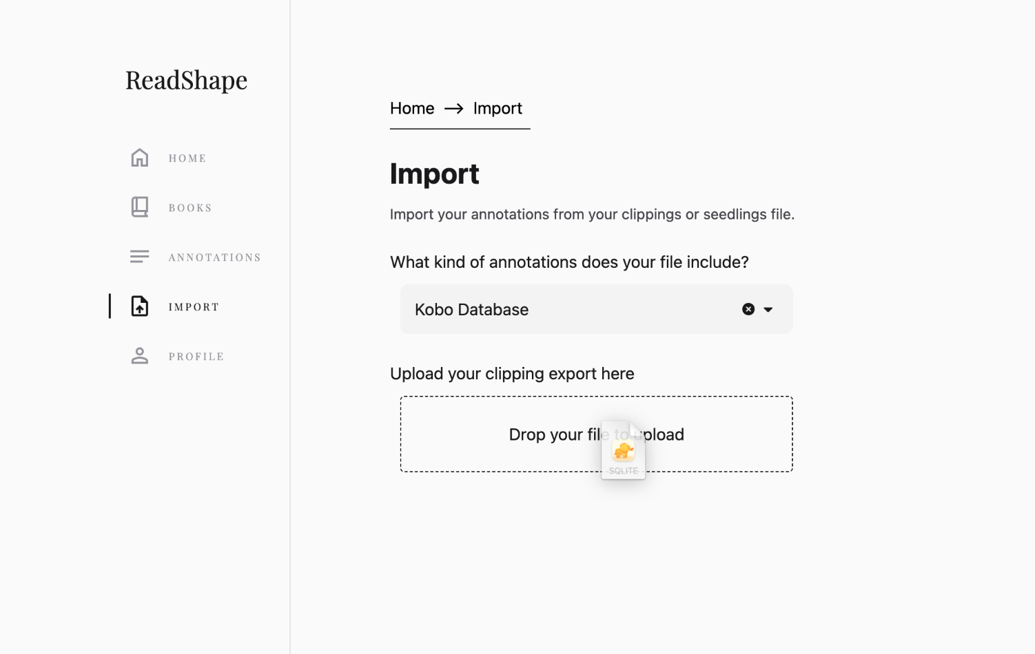 Now, in ReadShape, navigate to the “Import” page and select "Kobo Database" from the dropdown. Then, upload the saved KoboReader.sqlite file