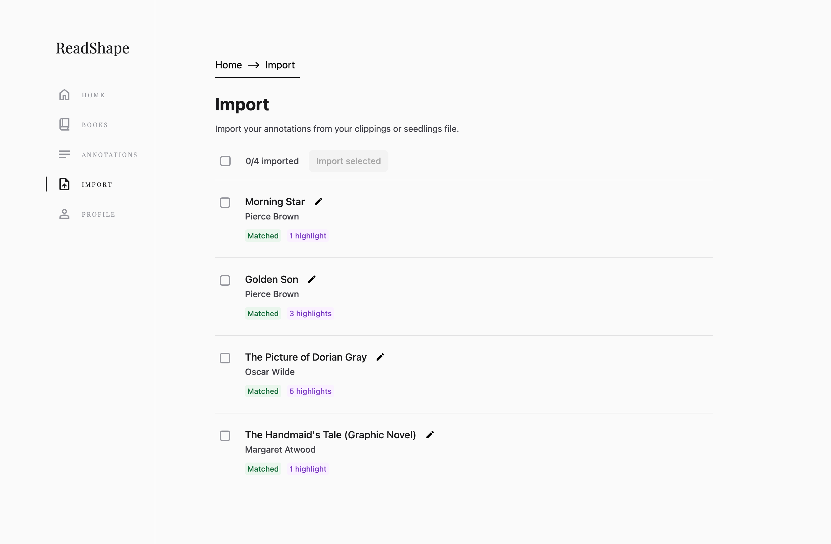 💡 Note: ReadShape will automatically try to figure out what book each highlight belongs to in order to find the cover, full author list, and other details.